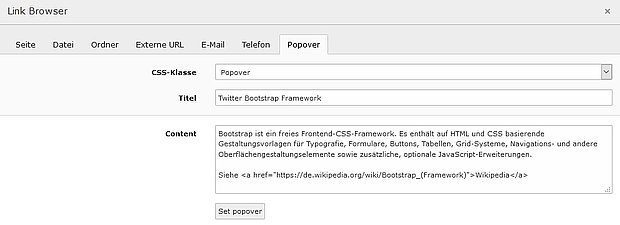 Popovers werden vom Bootstrap-Framework bereit gestellt. Sie erlauben die Anzeige von Zusatzinformationen in einem Fenster. Popovers können mit Hilfe des Link-Browsers über das Register Popover einfach definiert werden.