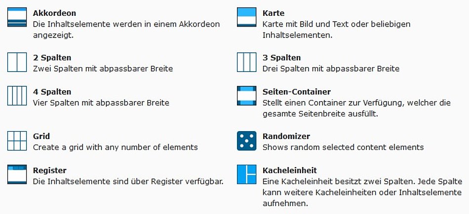 TYPO3 wäre nicht TYPO3, wenn es für dieses Bedürfniss keine Lösung, basierend auf Erweiterungen, gäbe. So sind verschiedene Erweiterungen zur Erstellung von Struktur-Inhaltselementen verfügbar. Pizpalue unterstützt dabei hauptsächlich die Erweiterung container, wobei die eigentlichen Elemente durch die Erweiterung container_elements bereitgestellt werden.
