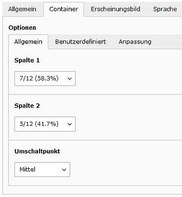 Die Standardspaltenbreite wird einfach über Auswahlfelder eingestellt. Weitergehende Anpassungen können im Tab "Benutzerdefiniert" vorgenommen werden. Siehe auch "Bootstrap grid options".
